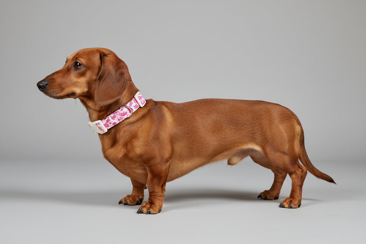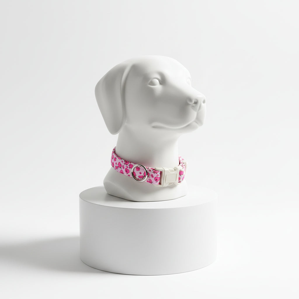 Dieses strapazierfähige Halsband in leuchtendem Pink mit weißen Herzmuster ist ein echter Blickfang bei jedem Gassi-Gang. In Größe L ist es perfekt für größere Lieblinge wie Golden Retriever, Labradore oder kräftige Mixe geeignet.